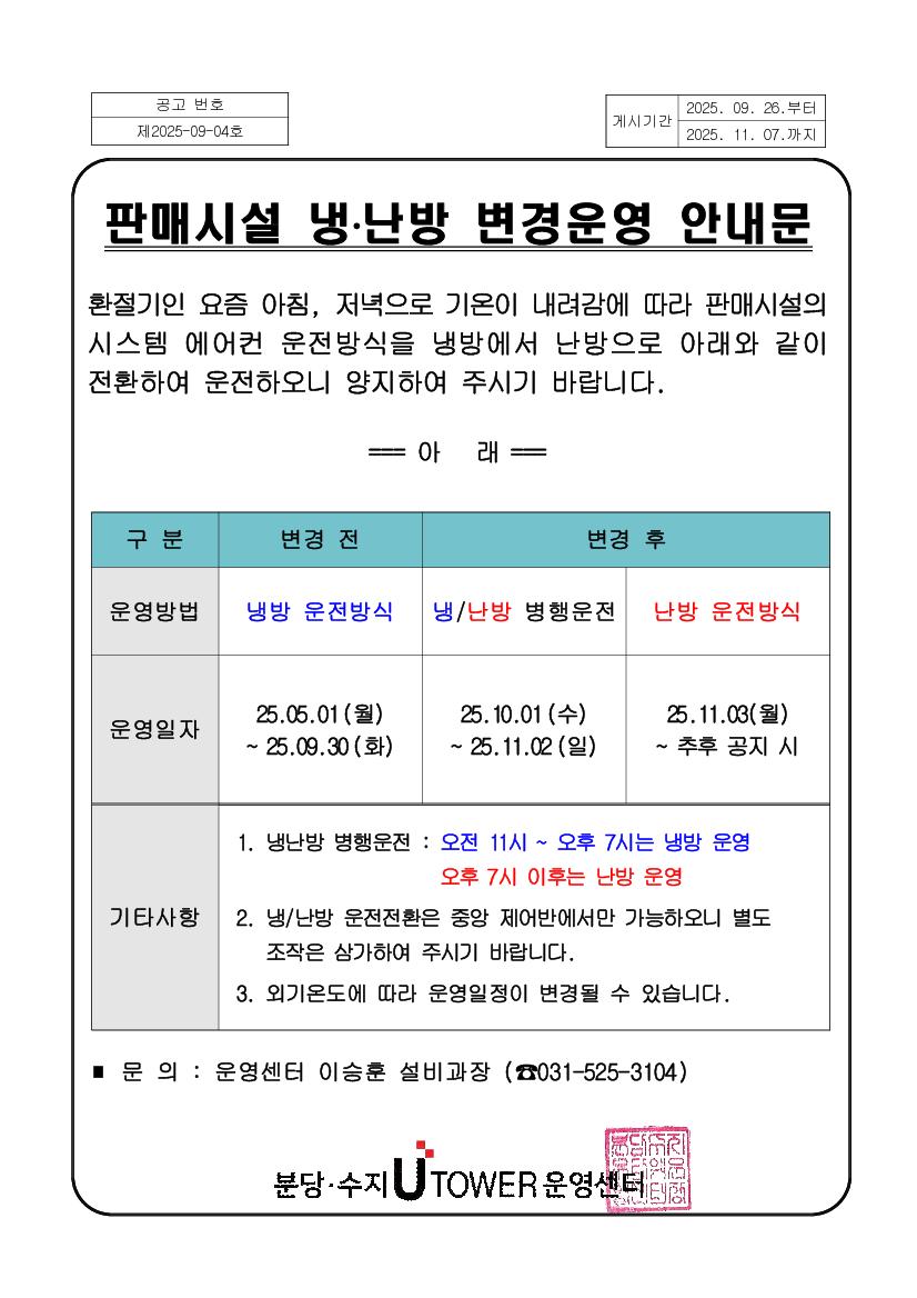 >> 판매시설 냉난방 변경운영 안내문 운영센터 87 2025.09.26