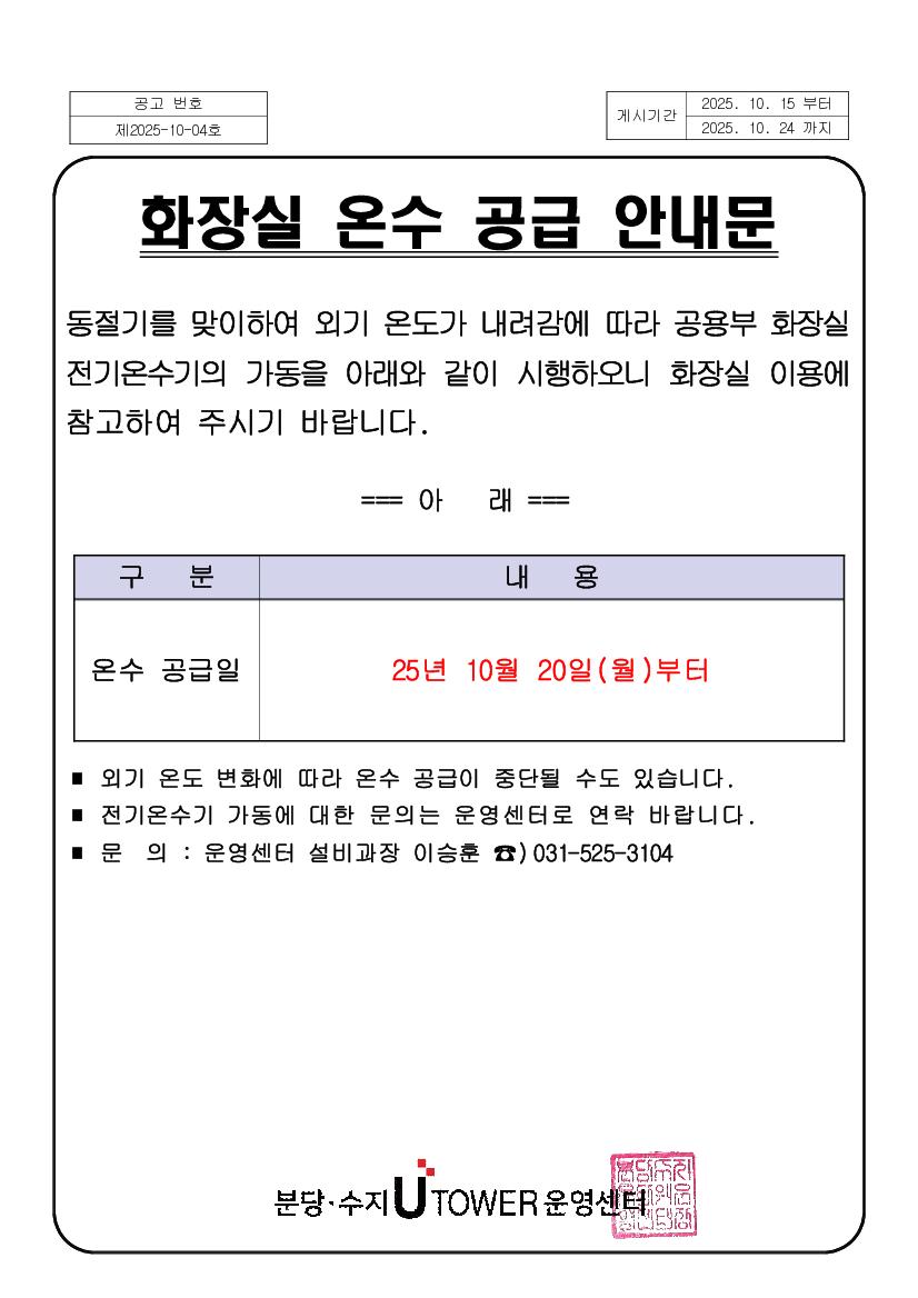 >> 화장실 온수 공급 안내문 운영센터 21 2025.10.15
