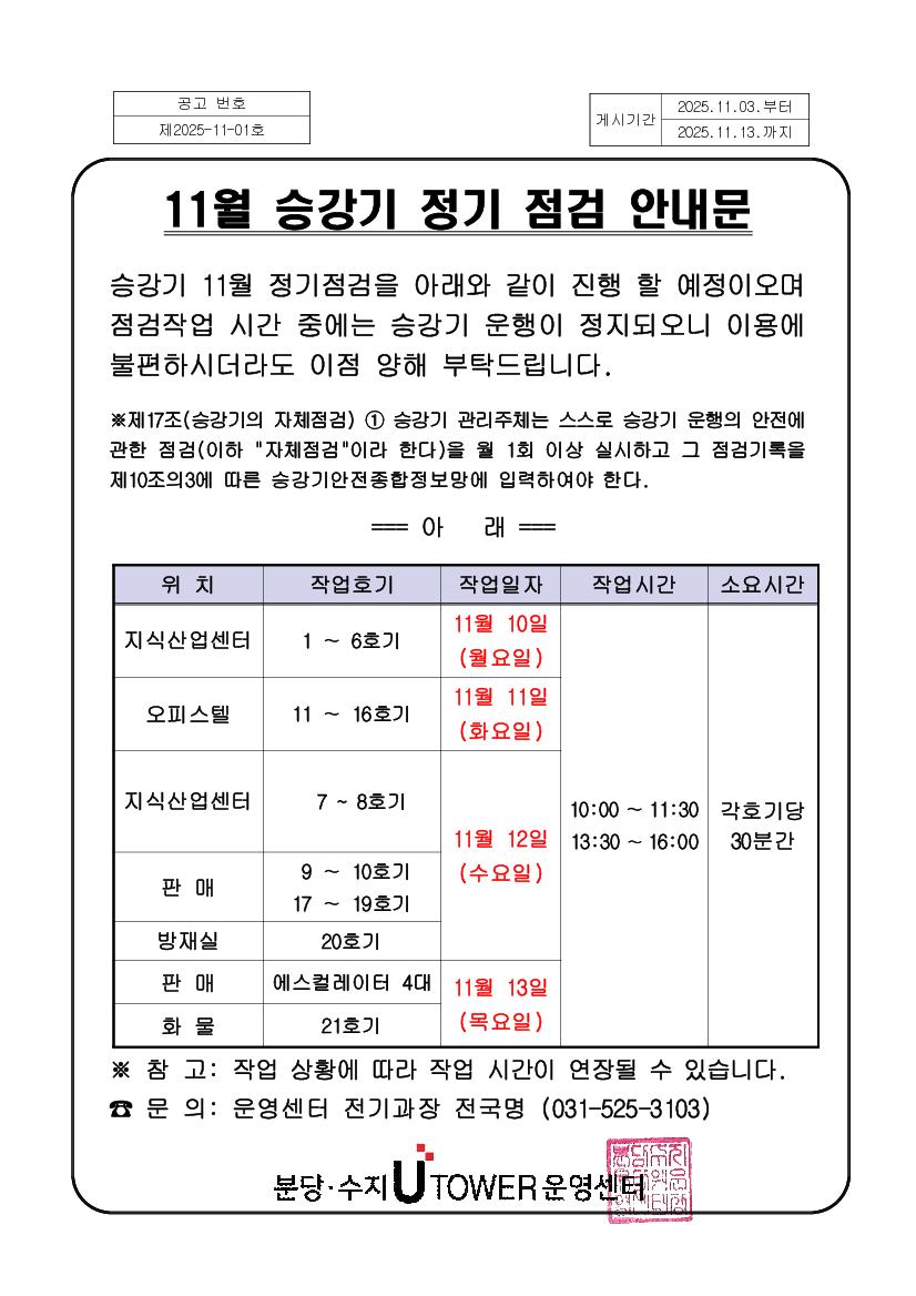 >> 11월 승강기 정기 점검 안내문 운영센터 25 2025.11.03