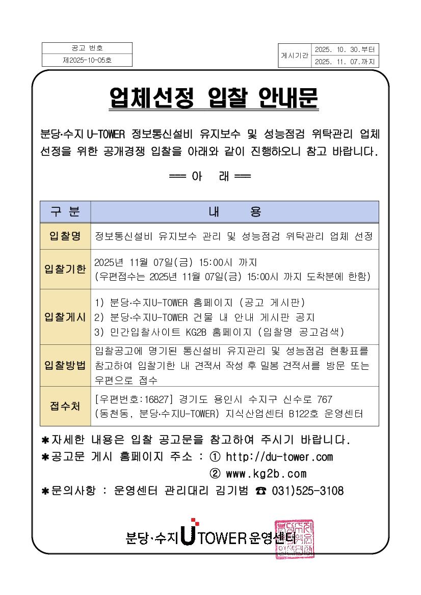 첨부파일 업체선정공고.pdf분당수지유타워 통신설비 현황표.pdf확약서(8).pdf
